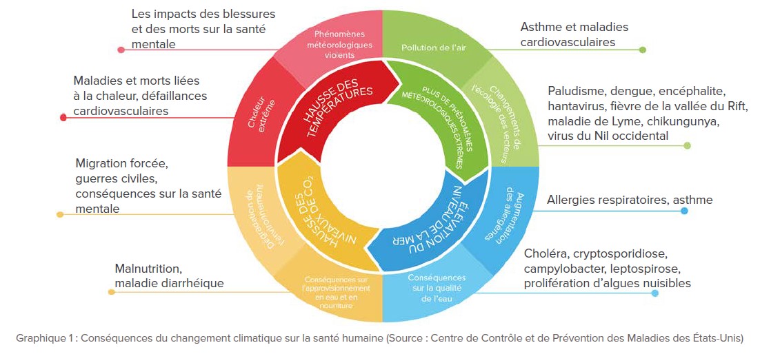 D’une part, le changement climatique a des impacts sur la santé humaine. Selon l’Organisation mondiale des médecins généralistes (WONCA)1 et le Lancet2, ces changements ont des conséquence déjà visibles pour la santé humaine : l’augmentation de la morbi-mortalité cardiovasculaire et respiratoire, des maladies infectieuses, de la malnutrition et la dégradation de la santé mentale (voir aussi graphique ci-dessous).